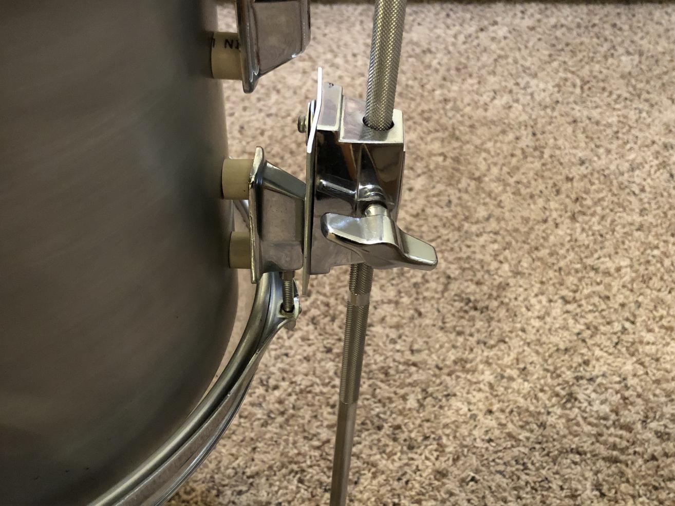 Clamp it, measure it up from flat table and drill a hole from the outside through the head rim and the shell. Tap it with 6/32 tap and put a screw in from the inside.