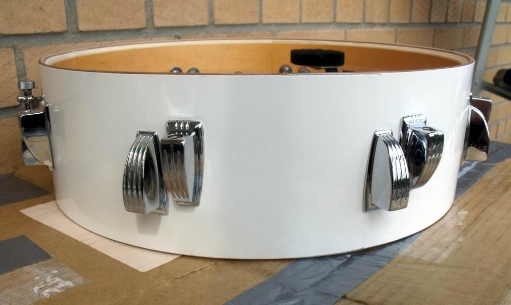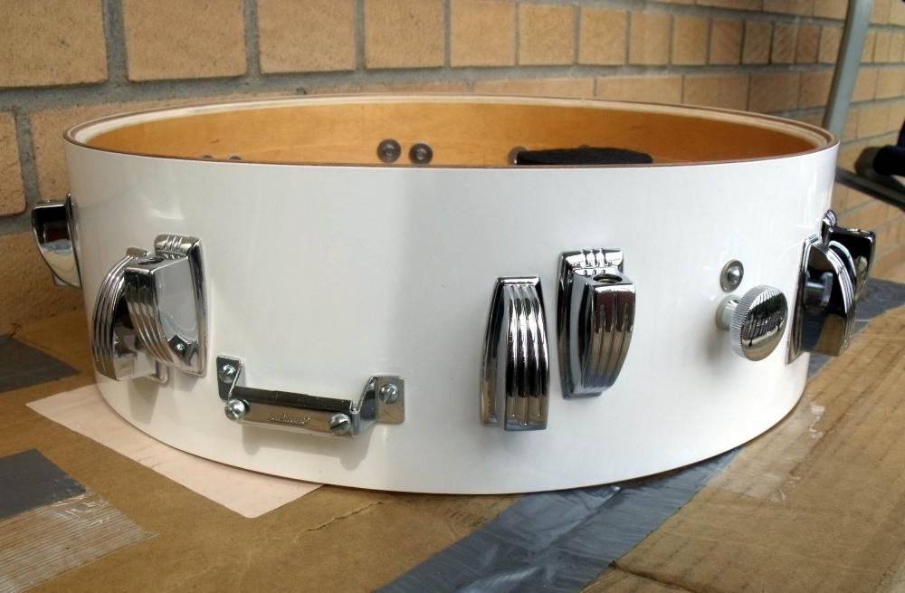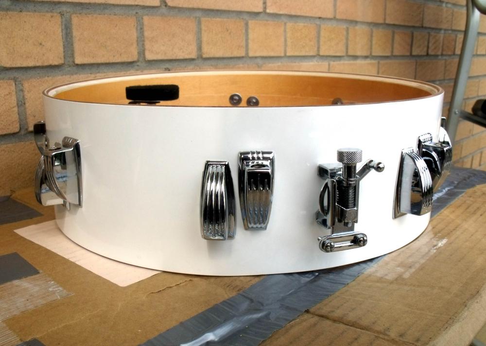 I wanted the snare to resemble in a way the 60's Ludwig Downbeat Piccolo and the late 60's Slingerland Piccolo that Buddy Rich used. But only Using period correct parts from the late 70's. So I hand measured, mapped out, and drilled the snare for 16 Small Classic Lugs in a off set position, like the Buddy Rich Slingerland piccolo. I went one lug down one lug up like the Downbeat piccolo. The Downbeat had single rectangular shaped lug with it one tension rod down and one up.