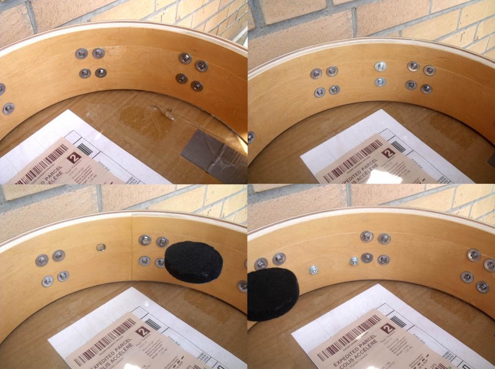 This snare started life as a Concert tom. It was originally 14" round X 13" Deep. The shell had many extra holes drilled into the top and bottom portions. I took the shell to a custom drum builder and had the center undrilled portion of the tom cut out. We were able to get 4-1/2" out of the center but Lost a 1/4" after we trued up and cut new 45 degree baring edges. The shells depth is 4-1/4". Once that was done I bought the shell back to my place.