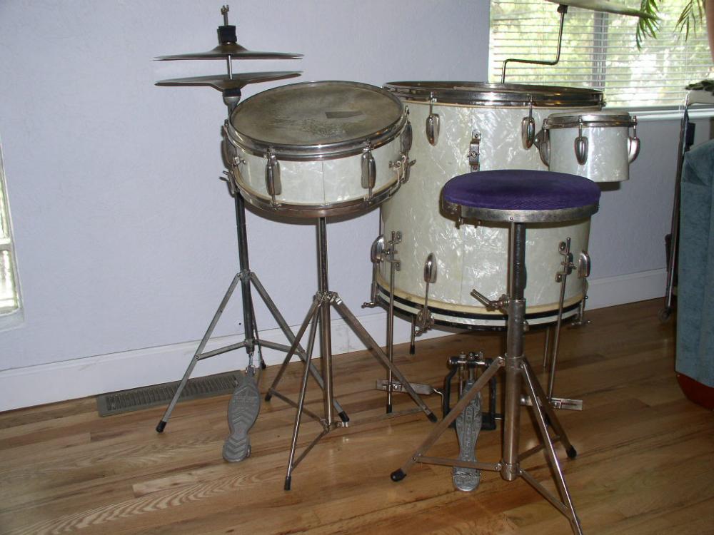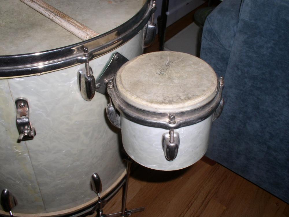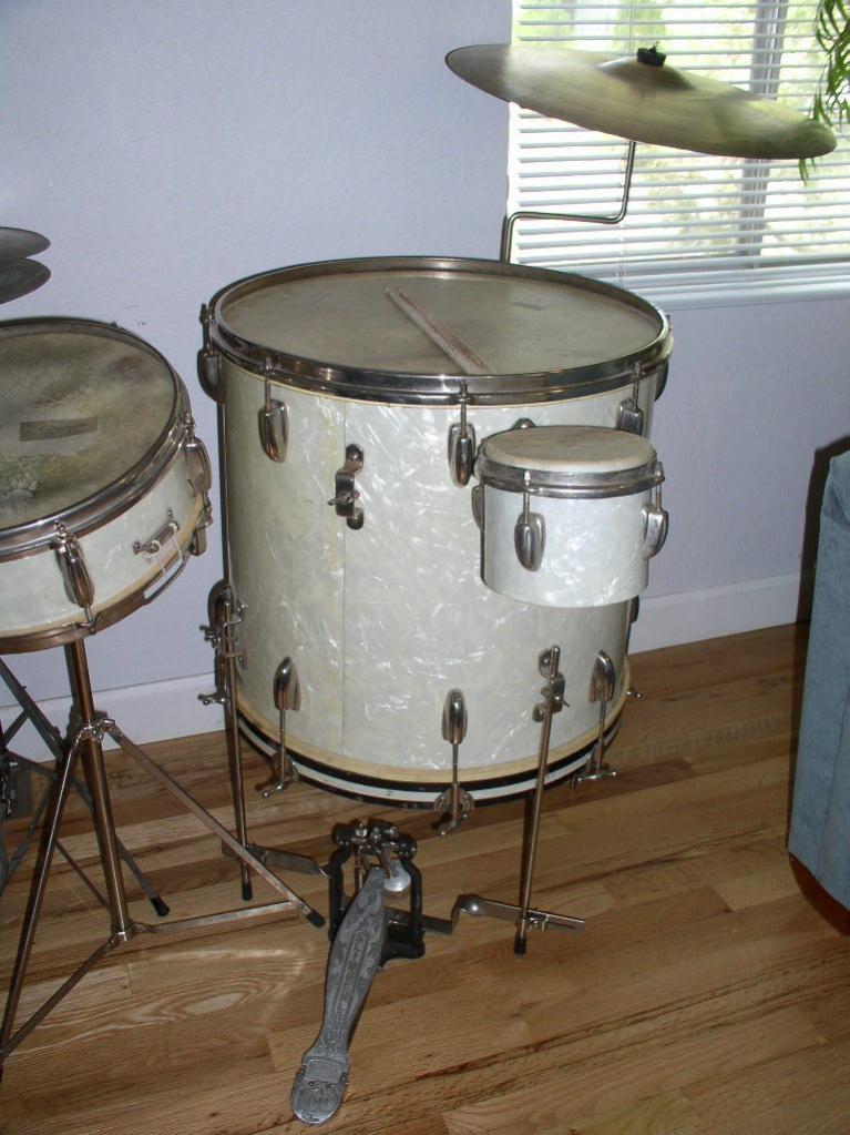 A vintage cocktail kit. Cool! Even though there seems to have been a market for cocktail kits over the decades, in my 73 years I have seen them being used on a gig perhaps 2 or 3 times. Most cocktail kits tend to have a smaller snare drum attached directly to the floor tom/bass drum to meet the original goal which was an ultra compact easy to use, easy to set up kit taking up minimum space in bars and cocktail lounges. Most were intended for playing while standing. This setup is obviously intended for sitting. I have even seen a few which eliminated the snare altogether and had snares under the top head of the floor tom. Of course the weakness of that approach was the need to release the snares to get a tom sound. Was this kit referred to as a Be Bop kit by Slingerland?