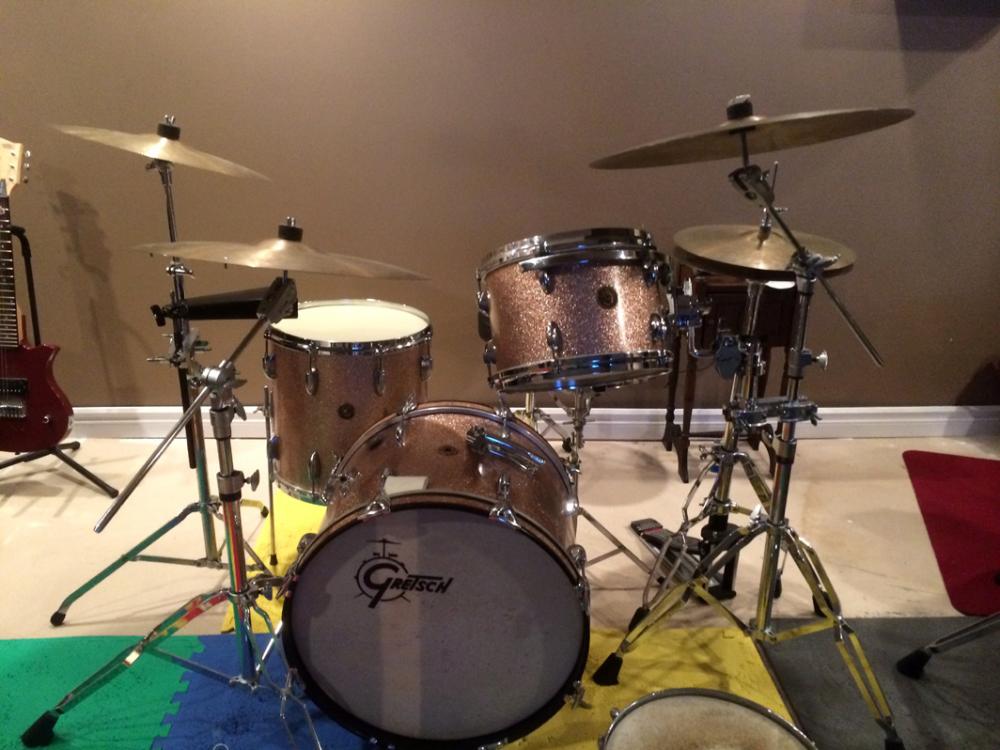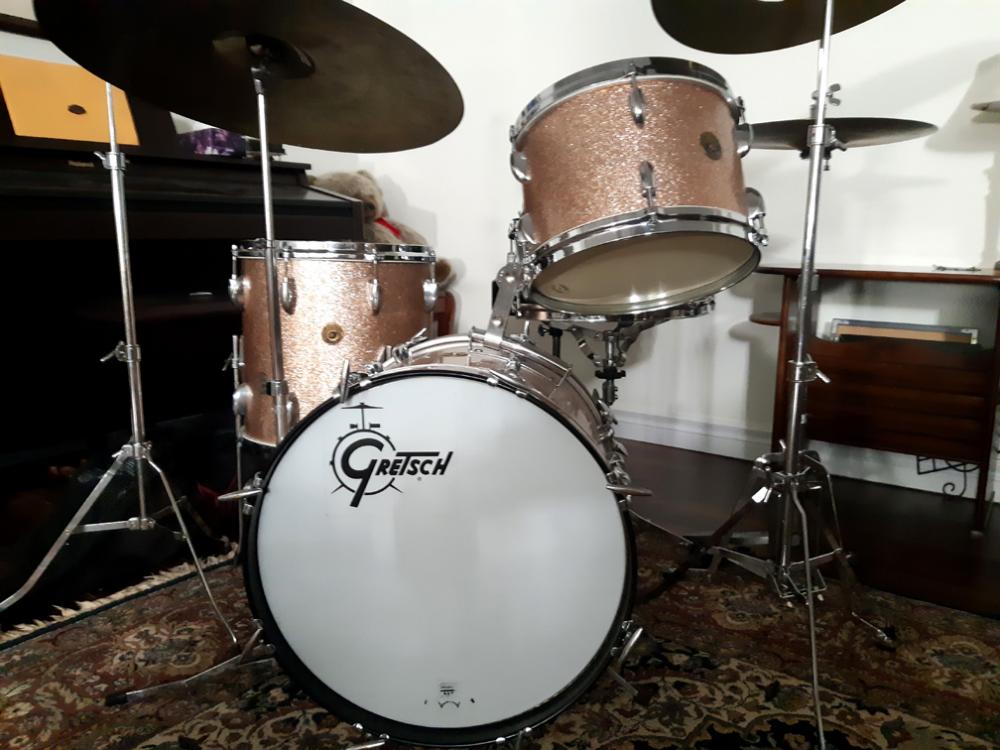 1960's Gretsch Progressive Jazz Champagne Sparkle 20, 14, 12. No extra holes, original bearing edges in good shape, came together as a set. Black paint removed from drums. Asking 3,200.00 US.