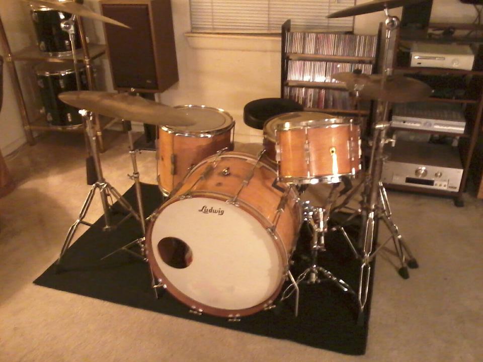 I restored this kit in the mid 90s and put a lot of work into it ... one of the previous owners put a pretty good sized hole in the top of the bass drum ... I have a Shure kick mike mounted with a May system and the mic in covers this hole very nicely 1964 Ludwig Club Date kit 22,12,14 the 5 by 14 snare I picked up later 1961 Ludwig Pioneer in mahogany ...