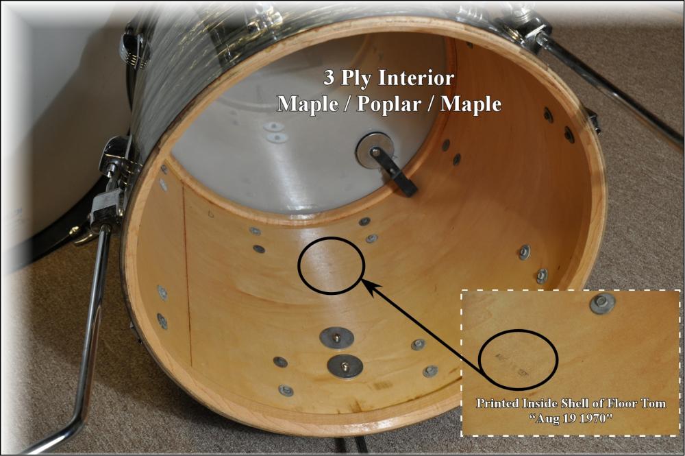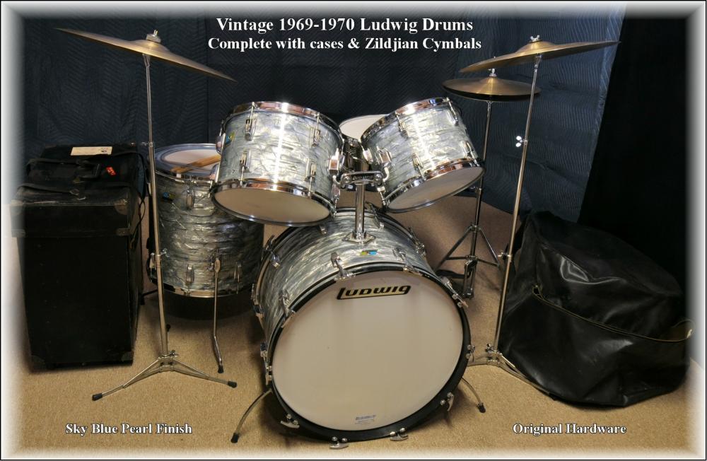 Original owner and never professionally played… although they have been moved a bit, they are in very good to excellent condition. Original construction and wraps. They spent most of the time in their respective storage cases. Some drum heads are original and some have been replaced. The logo on the front bass skin is original. The black, wood rim on the bass drum, where the foot pedal attaches has a minor crack. Normal wear, minor scratches and minor pitting are evident relating to the respective, passage of time. Most areas will clean up well. Date on interior shell of floor tom reads Aug 19 1970. Other shells read Aug 1970 dates as well. I believe some parts are 1969 and some are 1970 however it was purchased all at once, with cymbals, new, as a set, in Sept. 1970.