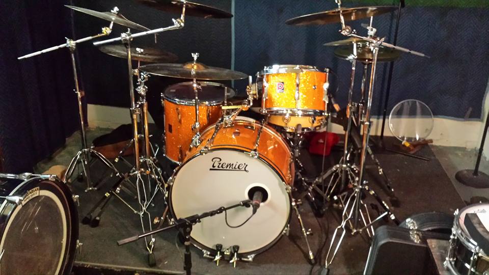 Yep, one more Premier kit: this one is my studio/recording kit. 12, 16, 22 in gold glass glitter wrap. Slotted tension rods, cast hoops... It just sounds SO GOOD under the perfect pair of microphones. I have it all deadened for recording, but the drums sound incredibly deep. I have the batter heads tunes a bit high (so they don't dent easily, mostly) & the reso's a bit low, but this kit still sounds DEEP. Very "nineteen seventies" sounding. And it looks great, too!!!!