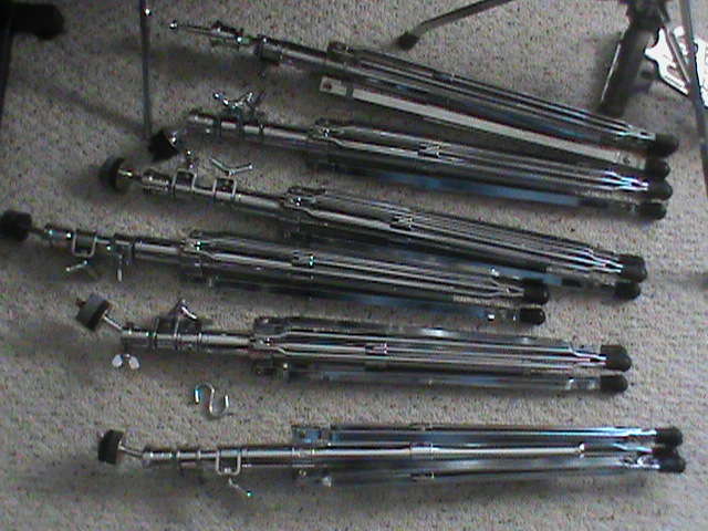The kit came with no cymbals or stands. Over the one year I have been the kit owner, I have accumulated six Samson II Floor Cymbal Stands, 48-0512, Description: Medium height cymbal stand featuring the solid Samson base with built-in tilter.