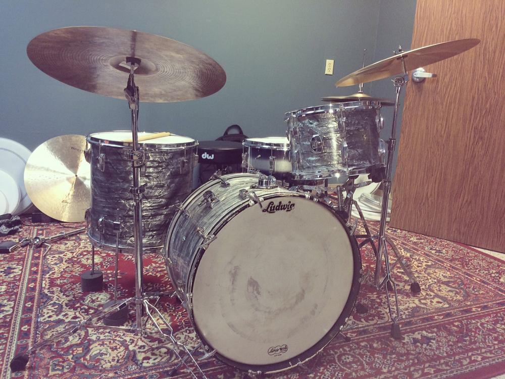 My favorite finish - Ludwig Sky Blue Pearl. Beauty!! Why is your floor tom wearing shoes?