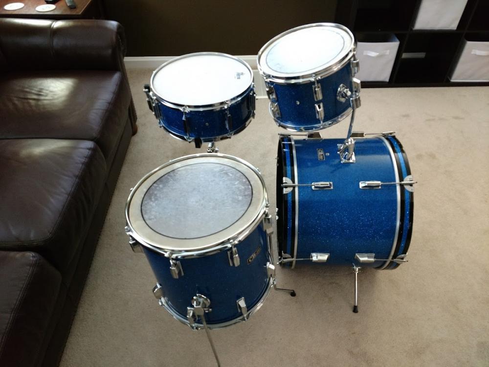 The snare is a "Tempro" brand, but the wrap matches exactly with the rest of the kit. The blue glitter wrap is in great shape and there is no fading anywhere. It looks great. There is a small amount of the wrap buckling slightly at the bass drum lugs, but it's not bad at all. This kit is in excellent shape and has been well taken care of. Gloss lacquered wood bass drum hoops are in great shape, and have brand new, Blue Glitter inlay from Precision Drum Company in NY.