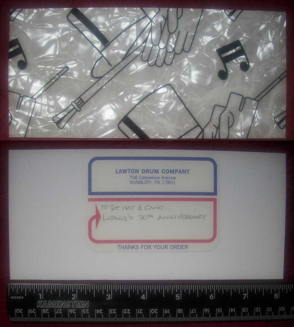BTW, I passed on it for the engraved Black Beauty because I already had a limted edition African Satinwood snare (I didn't want two snares that looked different but sounded the same, I saw no point in that), and really wanted a black beauty at the time. Also, I always thought the tophat & cane wrap was a bit...well....fugly. Too busy, you know? A lot like Leedy's "Autographs of the Stars" wrap from the same time frame (of the original wrap that the new stuff replicates). No disrespect to Ludwig or Jack Lawton, but.....it was just plain fugly.