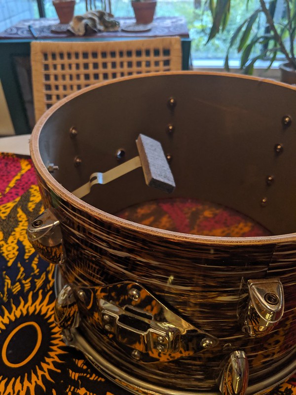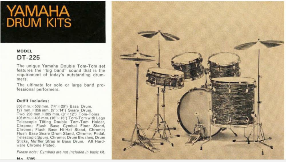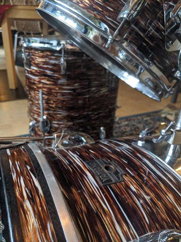 Any vintage Yamaha experts in the crowd? Have I got a million questions for you! I picked up what I'm 90% sure is a Yamaha DT-225 set in brown willow pearl from late 60s/early 70s, in pretty great condition all things considered. Two 12" mounted toms, a 16" floor, and a 20" bass with wood hoops. Not a museum piece, and there's a couple missing screws and the floor tom is missing its reso hoop. Someone also drilled one of the 12" toms for a new tom mount, but at least the original mounting plate covers the new holes.