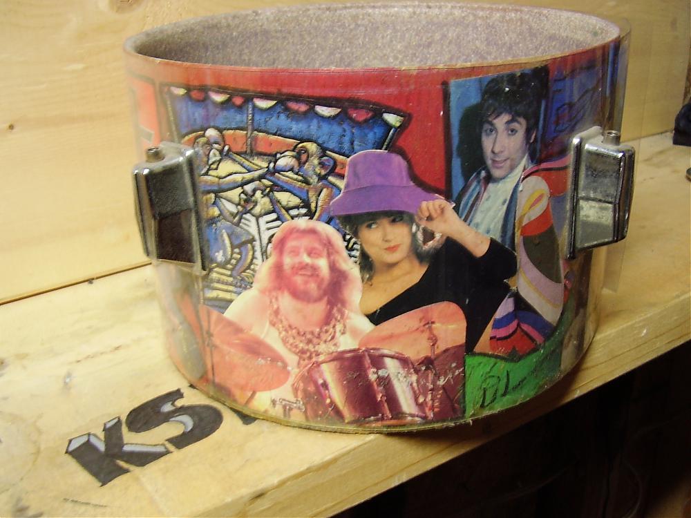 Ok bunnyman now you got me in the spirit of the decoupage drum set . it's time for me to make a piece that people will spend some time looking them over and say i remember those things / or that day . but you will alway's have me beat on the attention getter with the hotties ;) . for the one's that may want try this the easy way to do the finish is the use of very thin clear plastic wrap , just like the photo posted of my son old concert tom . this way if you ever wanted to add or removed the pic's you can . and if you ever wanted to refinish the drums you can with ease , cause you will not have to remove layer's of shellac or automotive clear coat .