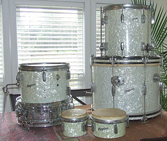 About 48 hours after taking home my new set, I was given a kind of pearlescent Rogers set from the 60s. For free! A local musician has had them since then, and he was moving and couldn't take them along, so he gave them to my grandpa, who didn't need them. So that's how I found myself going from wanting drums really badly, to having 2 complete sets in my livingroom.