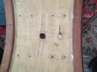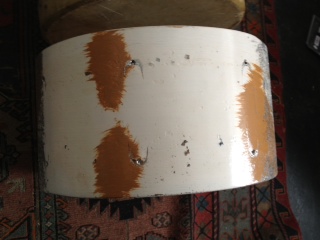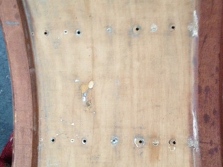 Here's a pic of some sort of mount on the bass drum that was moved and then covered over again, and some spurs that were doweled and filled. Anyone recognize the hole pattern?? Still not sure what make of drum this is. Will be the first drum I strip, so more info tomorrow....