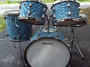 1966 Blue Satin Flame Slingerlands. Two 12 inch racks, 16 inch floor and a 20 inch bass drum. (modern combo?) Snare is not included. He is looking for 500 for these guys.