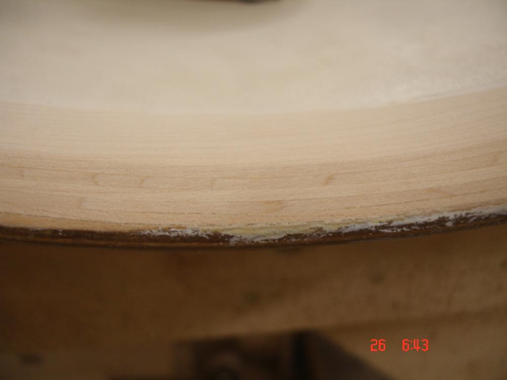 I ended up making six strips of maple 1/32" x 1.5". I actually cut a 45 degree angle on both ends of each ply to fit against the 45 degree cut on the existing ring. The first strip, or ply, was not glued to the shell. I glued the second ply to the first on using several c-clamps then repeated for each additional ply after about a half hour or so of glue setting up. Once all plys were glued up I took the curved piece of wood to my edge sander and sanded one side down so all pys were flush. I used that edge for the inside. After a little work with a small drum sander and lots of hand sanding I was able to copy the profile of the existing ring. Glued in the piece, did a little more sanding, paint and there you have it. Someone had painted the area of the shell where the ring was missing at one time, they got some paint on the edge that I should remove.