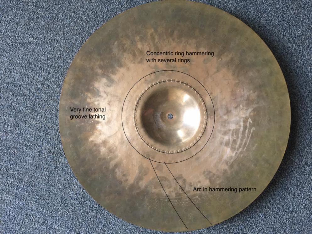 I've had a quick look at a few of these on eBay and they have the same hammering and lathing patterns as seen on the unknown Zildjian I annotated. What I can't tell is if there ought to be a pressed in die stamp on the Planet Z cymbals. I've seen one example of a specific Planet Z stamp, but that tells me nothing about whether or not they all had them during all the years they were produced.