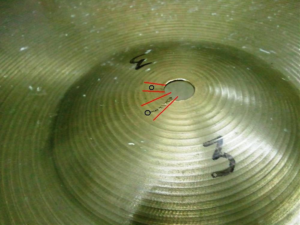 1960's Paiste Formula 602 22" Ride (pre-serial) with two cracks in the bell. I have attached a picture showing the damage. Red lines show the cracks.