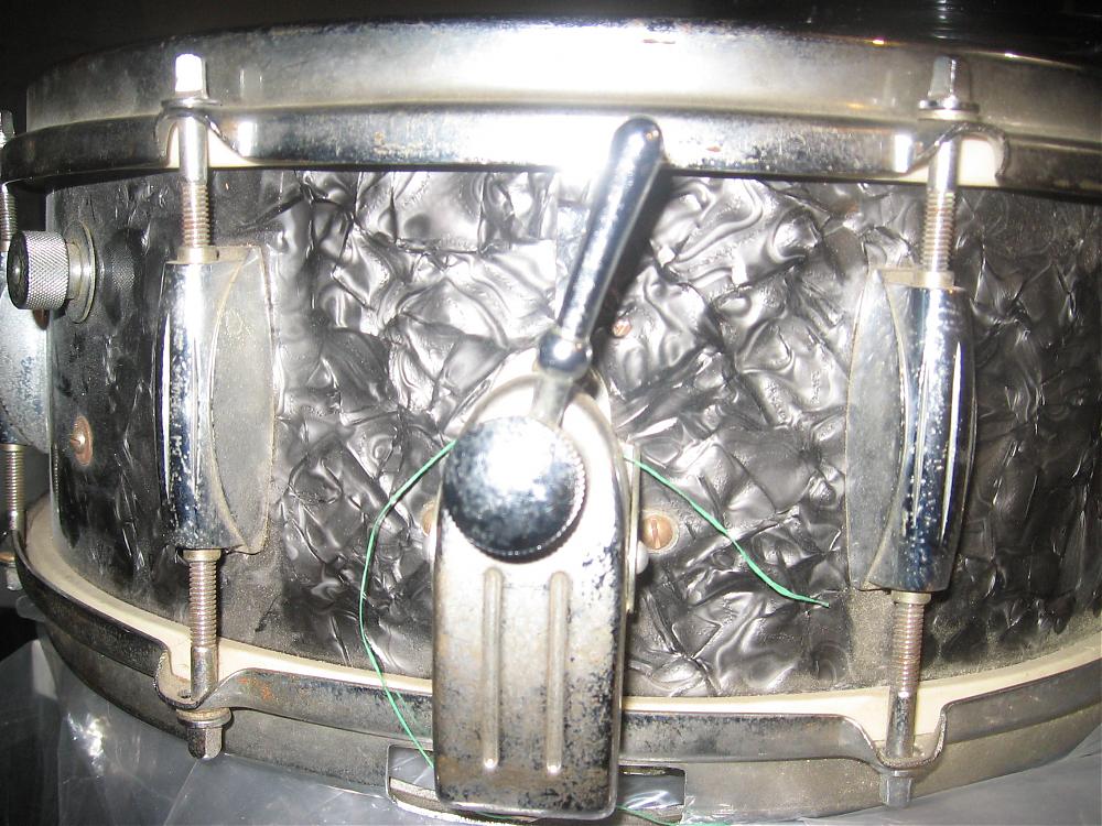 Not in perfect shape by any means, but historically significant nonetheless (for those of us who care, anyway.) Original heads on both sides of the snare drum, original heads both sides of the rack tom, 1 head/hoop missing on the floor tom, bass drum heads both look original.