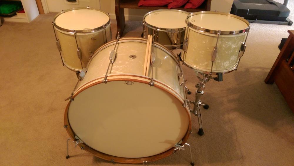 The White Marine Pearl looks very nice. There ARE places of discoloration which is typical of an almost 80 year old kit, but as you can see by the pics, this is a sweet looking kit! All the seams are nice and tight and the wrap is intact and in GREAT shape. It shines beautifully! I have TONS of pictures available in you need more information.