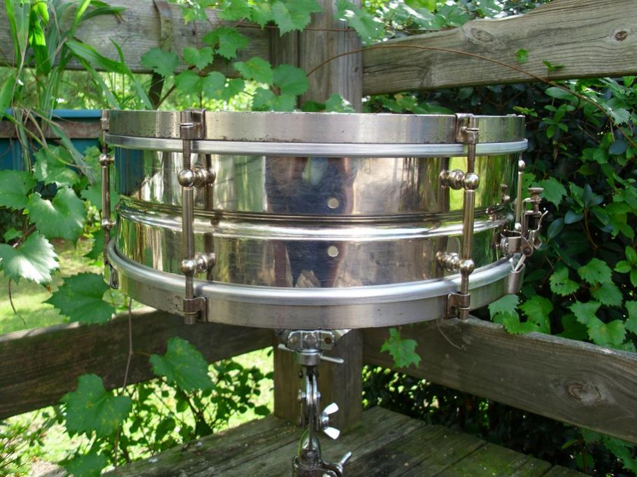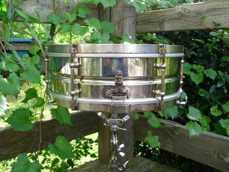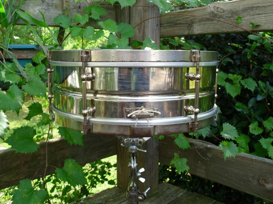 This is an early 20's(?) Leedy 5x14 6 tube lug snare drum. These did not come with badges. The shell is brass and has has the inverted bead. The shell is in nice condition. The nickel still has a good lustre to it. When i got this drum, it had been painted twice. The paint probably saved the finish a good bit. There is some surface scratching but no dings or damage. There are a few drops of a cream color on the inside of the shell from the first color. The rims are steel and so are the clips. The steel clips allow you to tension the drum to more "modern" tuning without the fear of them breaking like many of the brass ones do. I also have it setup with conventional 20 strand wires for a nice sound. The drum has no extra holes and appears to have all of it's original parts less heads and wires. This model is fitted with Leedy's Utility strainer. It works flawlessly. This drum gives a beautiful sound and looks very neat. Has a wide range of tuning. You could also slip on 6 lug triple flange hoops if you so desired. It has slotted tension rods. If you don't have a proper key for these, they are available. An old coin works good too! Drum has a like new Remo diplomat batter and also a Remo diplomat snare side head. It needs nothing and is ready to be put to work. Would probably clean up even better if you wished to do so. I don't like to go "too" far on these early models when i detail them. This is a nice early American made brass snare drum that can be purchased without hitting the wallet hard. Please pm me here or email to [email][email protected][/email] if you have any questions. Thanks for looking!
