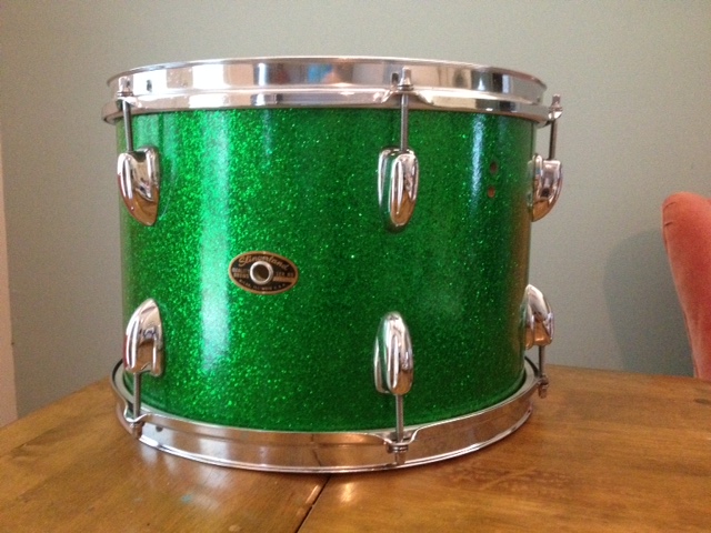 This is a late 60s Slingerland - see the chocolate milk interior - 9x13 tom in original green glass (sparkling green pearl, actually). The hoops and rods are not original and the muffler is missing. The diamond plate mount is present and in good condition. The drum itself and the wrap are in beautiful original condition with no extra holes and only minor scuffs.
