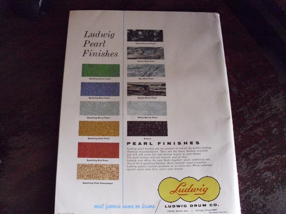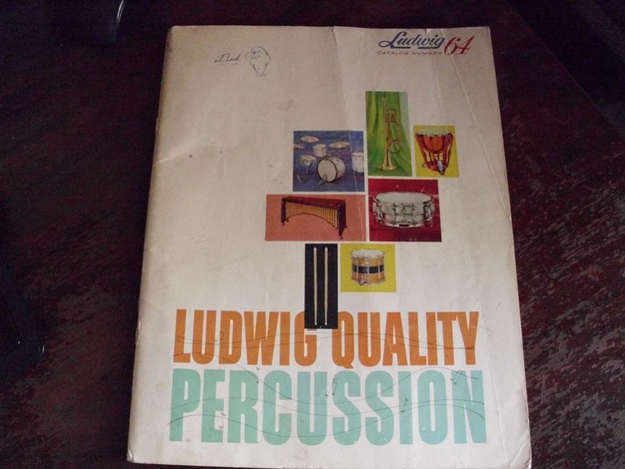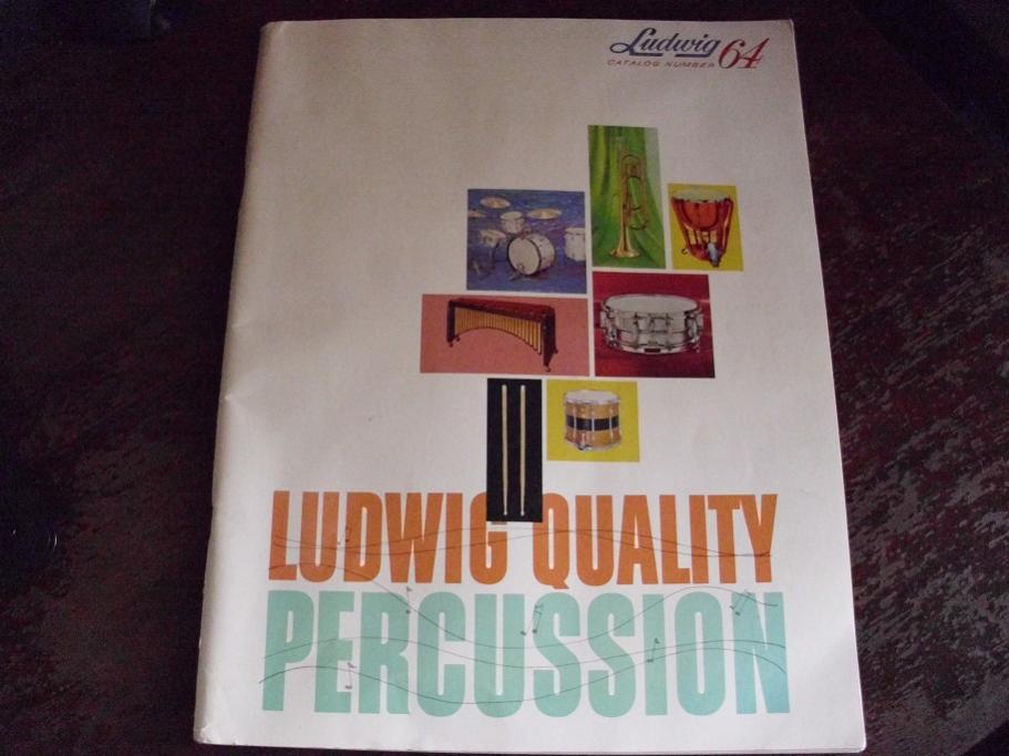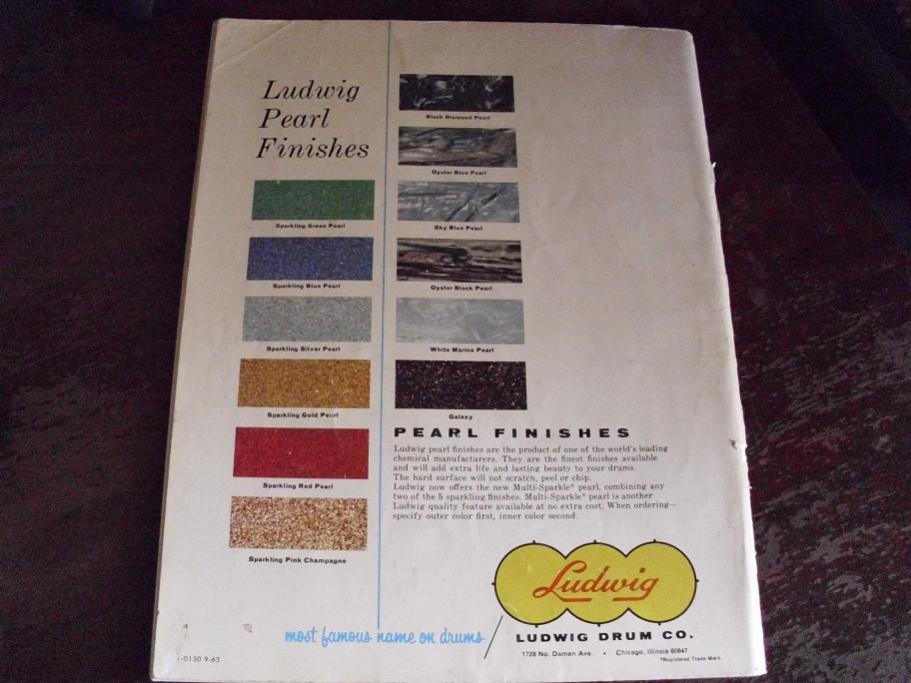 These are two Ludwig catalog number 64. The copyright mark on these is 9-63, right in the middle of Ludwig's glory days of the 60's. These are 96 pages of full color. This is a must for any Ludwig collector or enthusiast. The rear cover shows 12 Ludwig Pearl finishes. This the last catalog to show Galaxy as an available wrap. This also shows the New Acrolite. Also has pics of some great drummers that played Ludwigs as well.