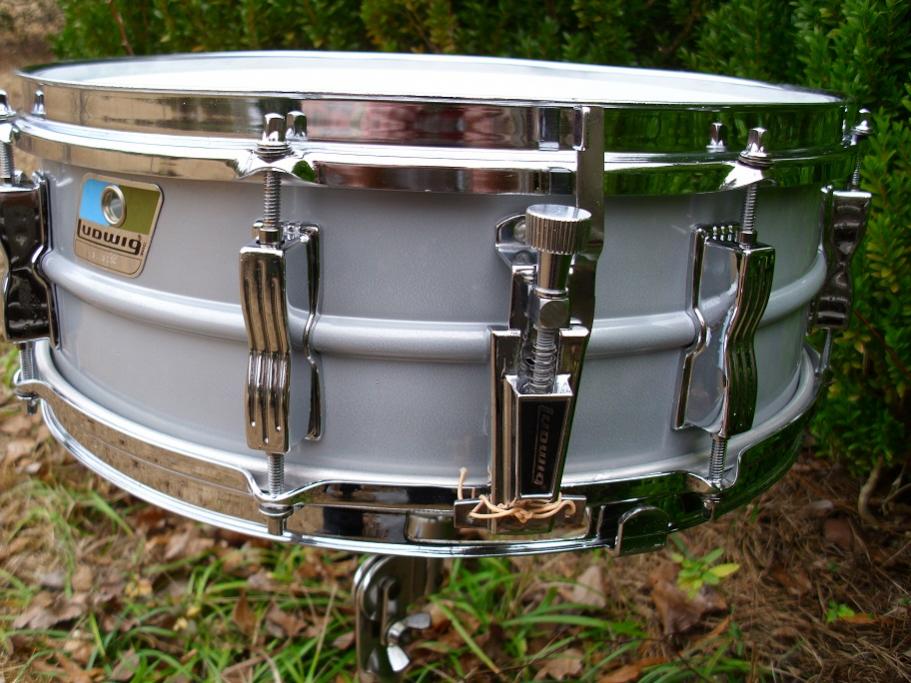 This is a very sharp looking 5x14 8 lug blue olive badge Acrolite. Serial number is 3113220. This drum is all original with the exception of heads and snare cords. Has a new Remo coated Ambassador batter and a fresh Remo ambassador snare side head. One dimple in the bottom head. I installed new Ludwig snare cords. The blackface 2 hole P85 strainer is nice and smooth. Has the proper block logo snare butt. Large round knob muffler works great. Chrome hardware is very nice with just a bit of pitting on some of the bowtie lugs. The hoops are like new. All matching tension rods and washers present. Shell has no scratches,scrapes or dents and has a nice look to it. Has Ludwig metal tip 20 strand wires. These late issue b/o Acros have lugs that can break at the lug mounts. I upgrade all of these with new longer machine bolts that go further into the lug casting. So, now better than the original design and no worries with this setup. This drum looks and sounds great. I spend 5-6 hours on each snare drum that I prepare. Would be hard to find one any cleaner. Same seamless Ludalloy shell as the Supraphonics. Drum has been completely detailed, tuned and ready to go. Please pm me here or email to [email][email protected][/email] if you have any questions. Thanks for checking it out. I will ship it out quickly for you.
