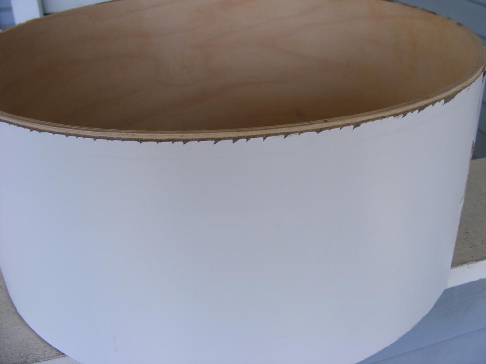 Hey d rum. I'm a scenic carpenter who also builds store display pieces occasionally. While I agree that countertop laminate is for the most part a bad idea to when wrapping drums. We also use a very thin laminate for projects when the design calls for a tight radius. Where as the standard stuff is about a 32nd of an inch thick. This stuff is more like a 64th. Don't quote me on those thicknesses exactly. You will not find this product at Home Depot but I'm sure it's available somewhere. If you decide to do this 3m super 77 spray adhesive on both surfaces and wait a few minutes to tack up. I do it in 2 parts to make sure my seam is perfect. Trimming excess laminate at the hearing edge is another story. I use a bottom bearing laminate bit. But with no surface for the bearing to ride you risk damaging the bearing edge freehanding something like that would be next to impossible. All in all probably more trouble than it's worth. Crazy tough surface though.