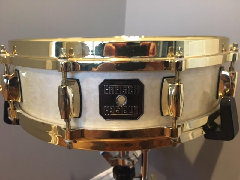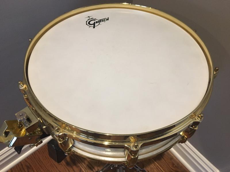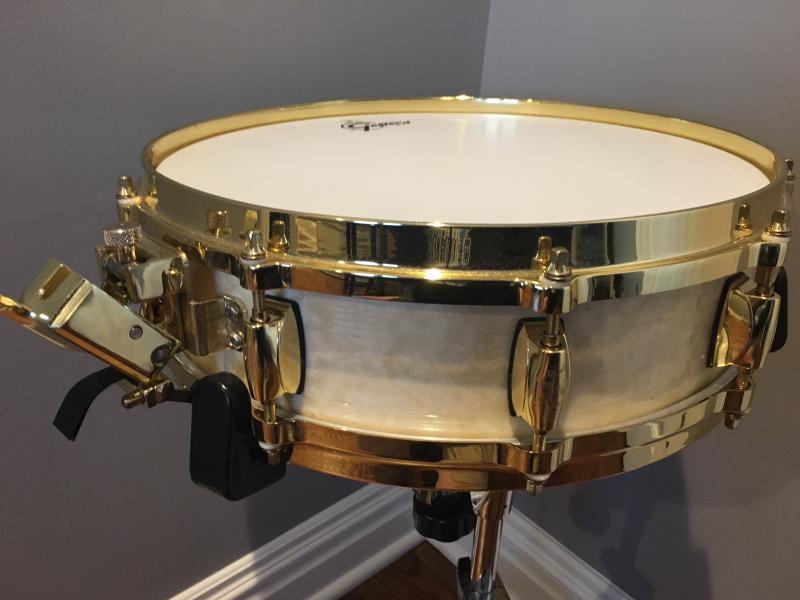 5 1/2 x 14 with gold hardware, die cast hoops, white marine pearl finish and has a gold snare as well. I have never seen one like it online.