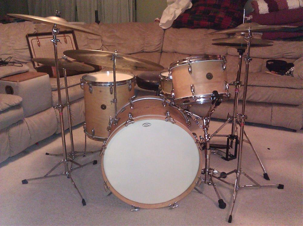 ...oh, I forgot to mention the sizes: 12/14/20. I used Howard's Restore-A-Finish on the naked shells, which were *almost* a stark white. The Restore-A-Finish brought color back to the shells and REALLY brought out the grain. I then used Howard's Feed-N-Wax to protect the shells. Each of the shells is really its own shell. The tom was an example of how Gretsch's shells were sometimes "slapped together", the floor tom has excessive quilting all the way around (looks like it's in the rain...), and the bass drum has the most beautiful grain of the three.