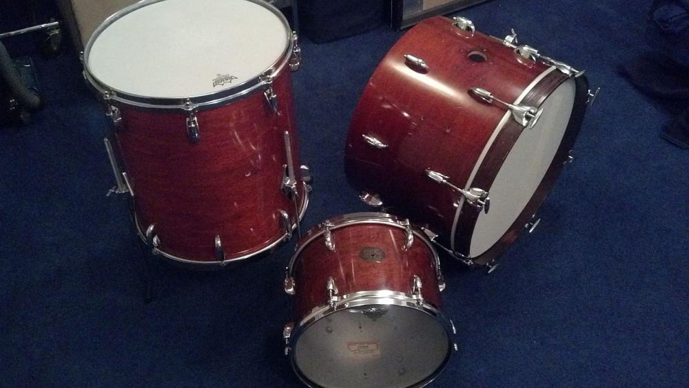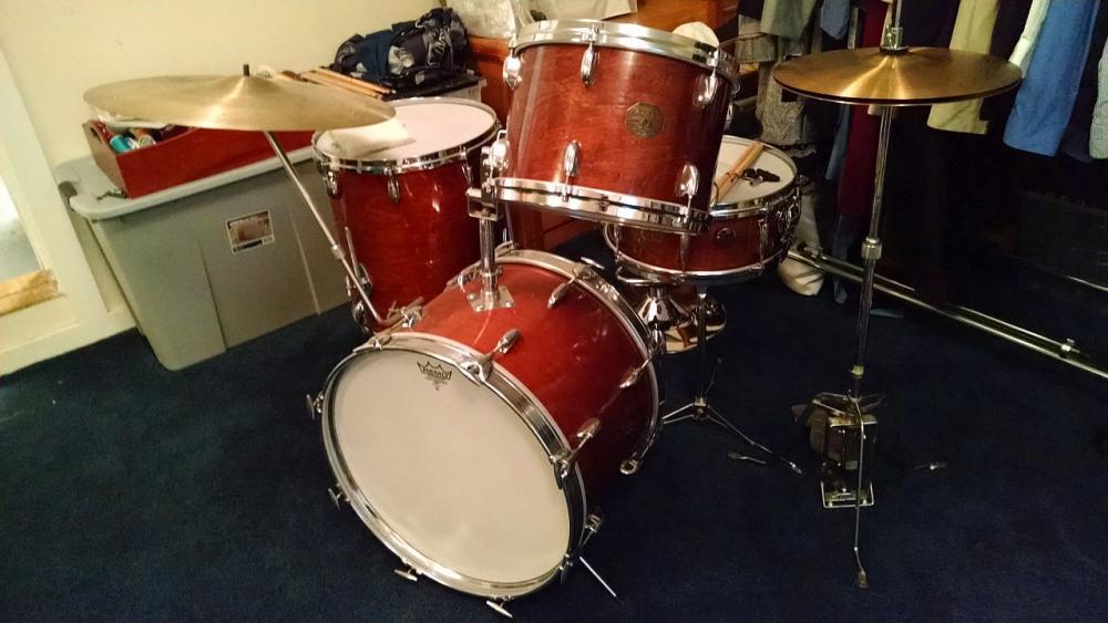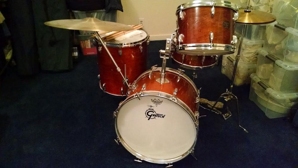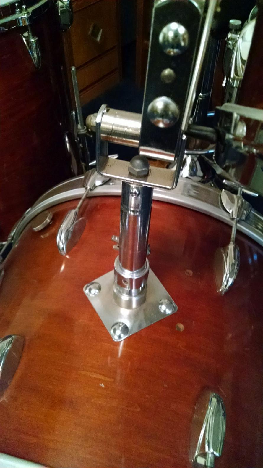 Just about complete. I fitted an original Gretsch double tom mount in place of the Ludwig that was there when I got the bass drum. Easy enough. Just had to enlarge the bolt holes outward slightly. No evidence of the Ludwig mount remains.