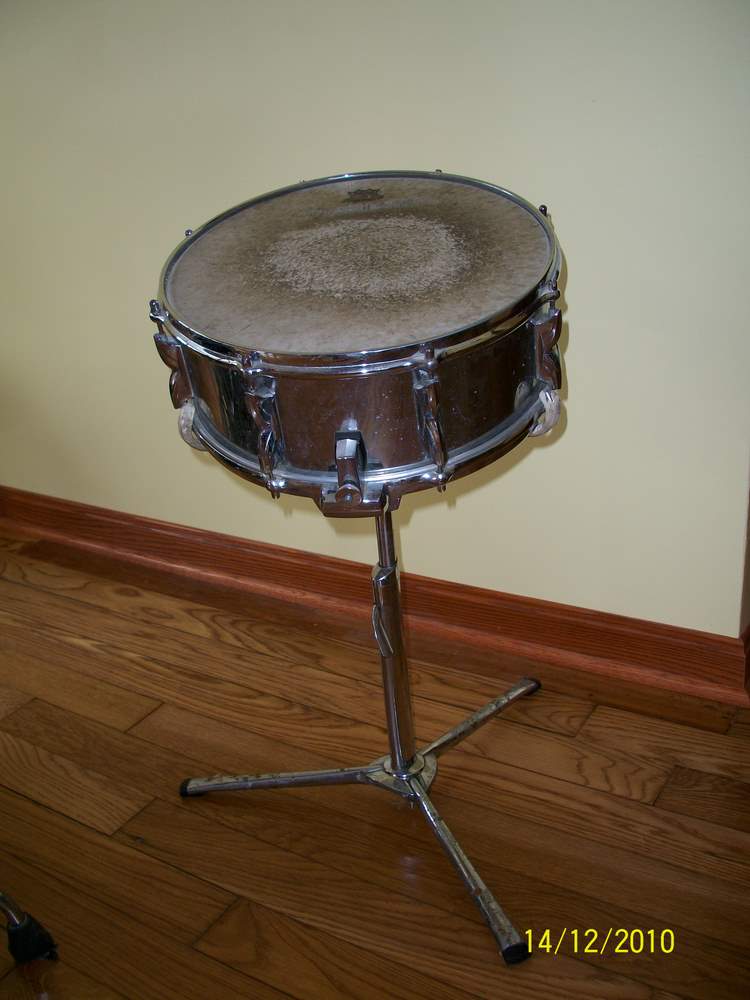 O.K. - here goes (I know the terminology because I've been married to this drummer for 30 years - picked up a few things except how to play well). By the way, love the quote from God in response to Nietsche - made me laugh! The snare stand is, indeed, Premier, as MrTurd pointed out (nice name - ewwww); the snare on the drum is made up of two sets of individually-tunable wires (with set screws), as well as the whole unit being adjustable. There are 12 wires on each set for a total of 24 wires, there are only five intact wires left (it needs new snares, obviously!). Am enclosing a picture of the snare drum. The drum set is located in northeastern Ohio, living in a state of dejection. I'll look into posting this to the non-USA forum, also (I hope they don't have any weird requirements for picture sizing!). Thanks, again, for all the input.