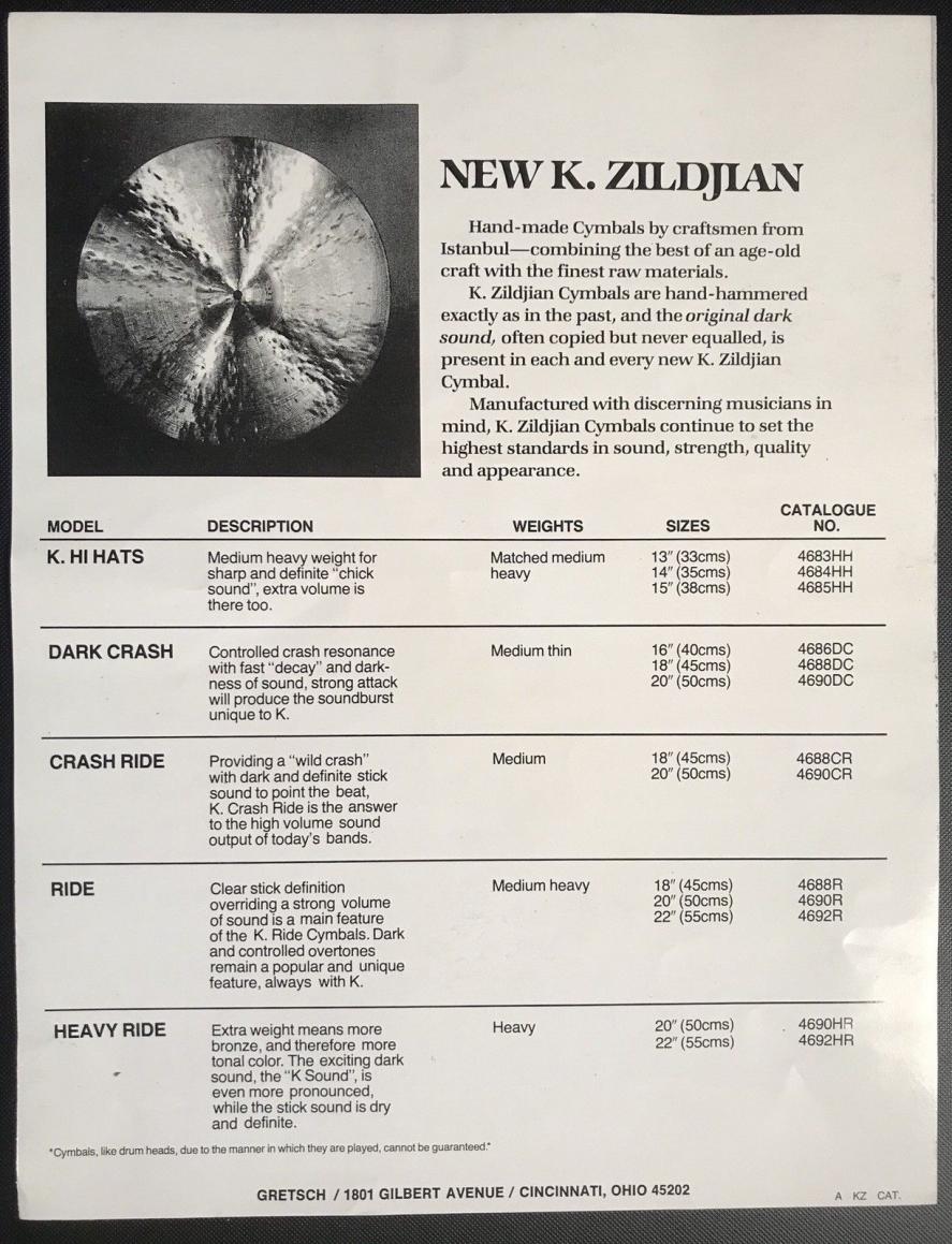 In another context you can see how Gretsch have alluded to Turkish origin (craftsmen from Istanbul) and not mentioned Canada as the origin for those cymbals. That tells us nothing about whether or not MADE IN CANADA was included on the trademark or not. Just that Gretsch were being coy in their ad copy. We already know that there were A. Zildjian trademarks with and without MADE IN CANADA. Again that has not yet been related to chronology, and in both cases we could be looking at a difference in the target market (USA and Canada vs rest of the world) instead of something chronological. We just don't know.