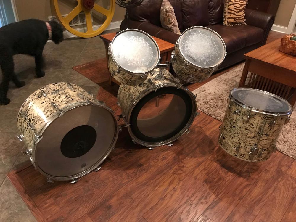 I drove an hour each way in pouring rain to answer a CL ad that promised "free spider webs" along with all the drum stuff pictured, for $300 firm. The pictures were the usual, dark and out of focus, but they made my spidey sense tingle enough to make the drive. On arrival I was greeted by a nice gentleman with a righteous handle-bar mustache, he walked me to the barn as he relayed the common tale of a son who had lost interest in playing and moved out leaving them with a bunch of drum clutter. It didn't take long to see that his price was fair, so I paid the mustacioed man and promptly filled my Volvo wagon to the gills with dusty gear.