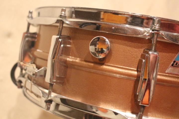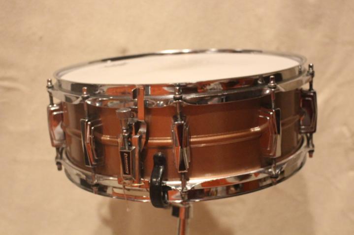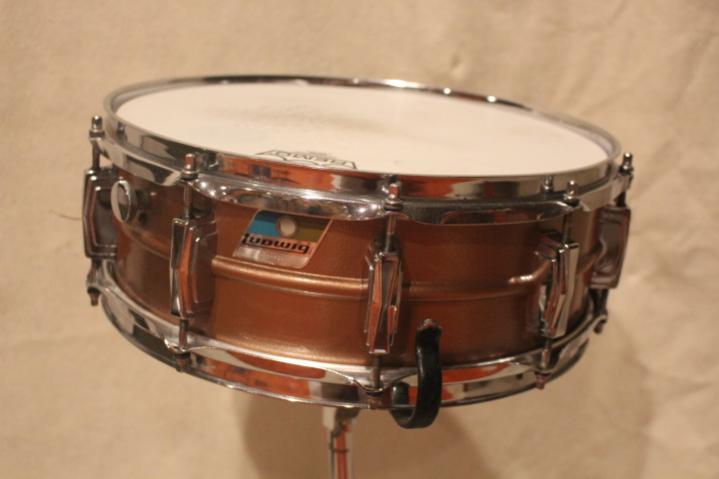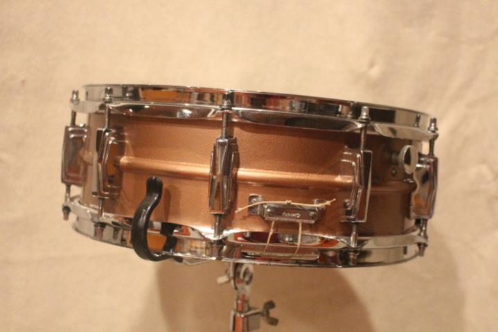 B/O Badge Supraphonic - This one came to me along with some painted Vistalites. Like the Vistalites, the snare had been painted bright red. Unfortunately when I removed the paint there was no shine left, it had been sanded down to the bare metal. After trying several other colors I ended up painting it this "hammered copper" color. $225 shipped