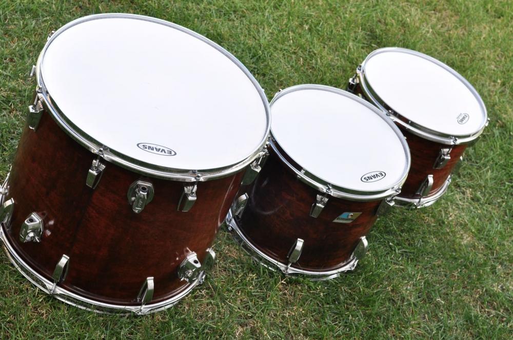 I got a super deal from a local music store, but was disappointed with the quality of the drums. With clear bottom heads, the inside finish had a few lacquer steaks that had run, and the maple reinforcing rings had some botched, crudely cut areas. It was an OK set with the 13x10 on a snare stand centered between the basses, and the other 2 mounted toms centered on either side of the 13x10.