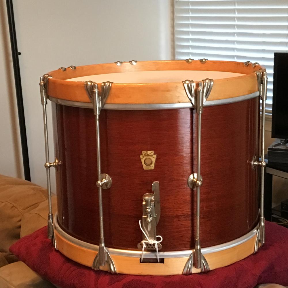 Hmmm...interesting...according to catalogs from that era, it's a Stadium model, since it has 8 tension rods instead of six. That model was available in pearl wraps, painted, or the mahogany finish. It doesn't look like it's been tampered with, and there are a few dings here and there, so i'm inclined to believe the finish is original.