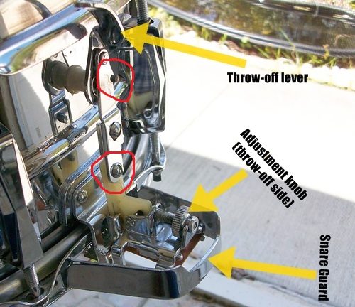 I appear to be missing a piece on the throw side. There is a hole at the top of the throw off lever which looks like it should have a post or something to stop the lever from travelling to far. I have circled in red what I am referring to in the attached (stolen off the web) picture. It is the top circle. Can anyone provide a detailed picture or description of what should be there?