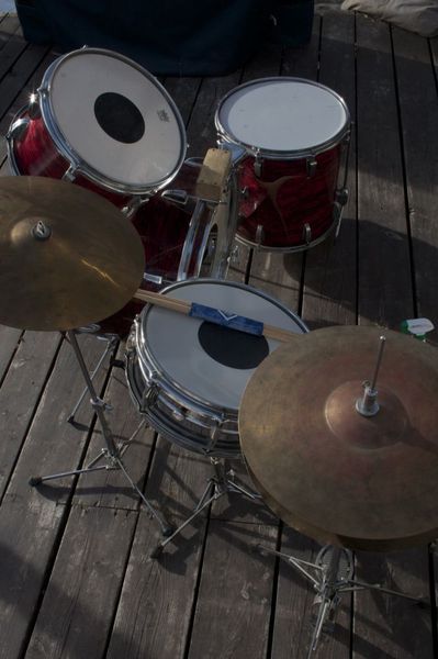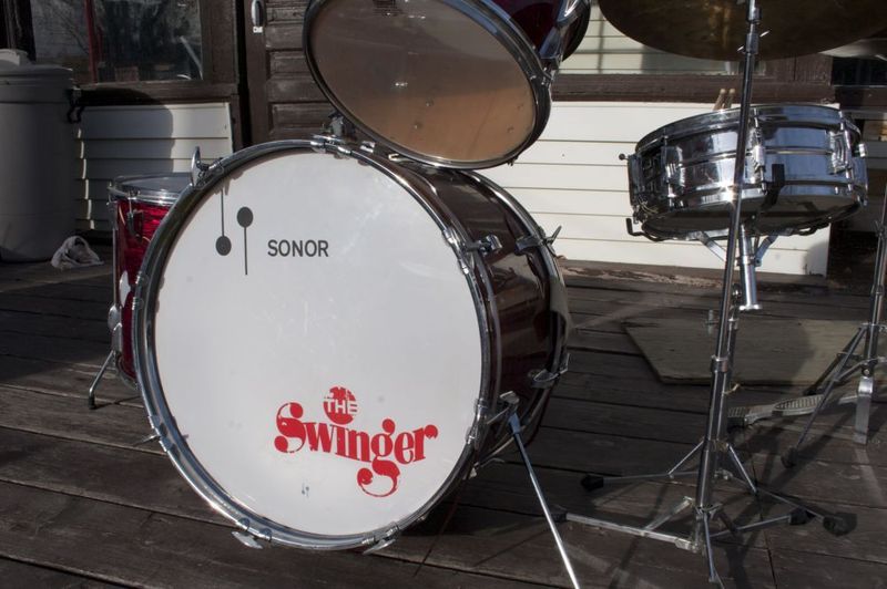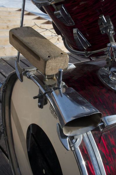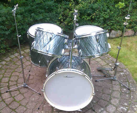 Sizes: 20", 12", 13", 16" plus 14" metal snare drum with parallel strainer system. Plastic lugs, stick saver hoops and slotted tension screws. All heads are still original and in good condition. Must have been played very gentle, all over the times - as I've been told, by a jazz drummer ...