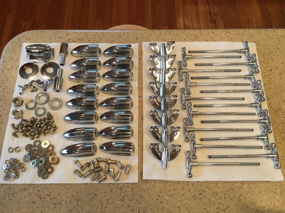 All the smaller hardware is clean. All that remains are the hoops, high tom mount, spurs and floor tom legs. Unfortunately a few tom lugs were damaged by the vinegar (works wonders on chrome, but it ate away at some of the threads in the casings), so I'll have to replace those. A few of the bass drum lugs are in rough shape aesthetically, but are functionally sound. Those will be mounted on the bottom, so no big deal.