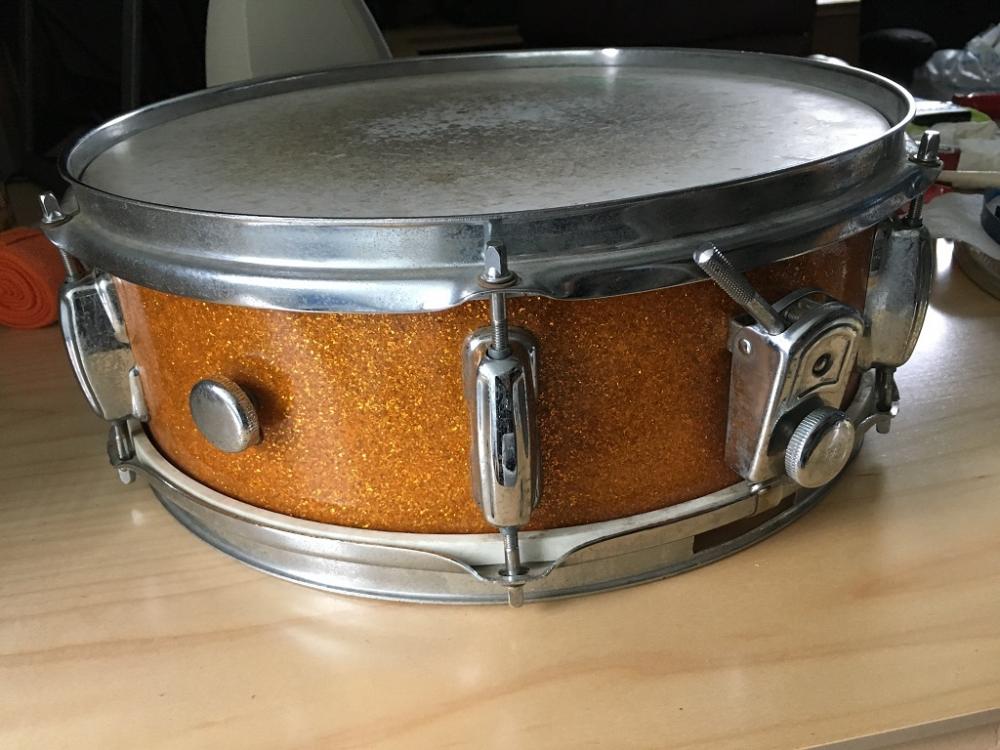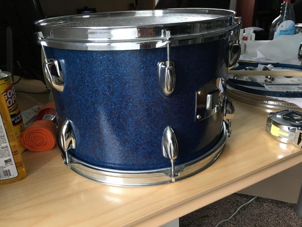 Lastly, I bought a gold sparkle 6-lug Slingerland stencil snare on ebay that had the strainer and butt I needed (and snares, although it came with a 12 strand so I may upgrade to a 20-strand down the road). I can also use the hoops for the 14" floor tom. It has no badge, but was described as a Mica brand. The hardware needs a good cleaning, but the shell (no re-rings) and wrap are in fantastic shape. It actually pains me to rob parts from it, but I may use it for a future project.
