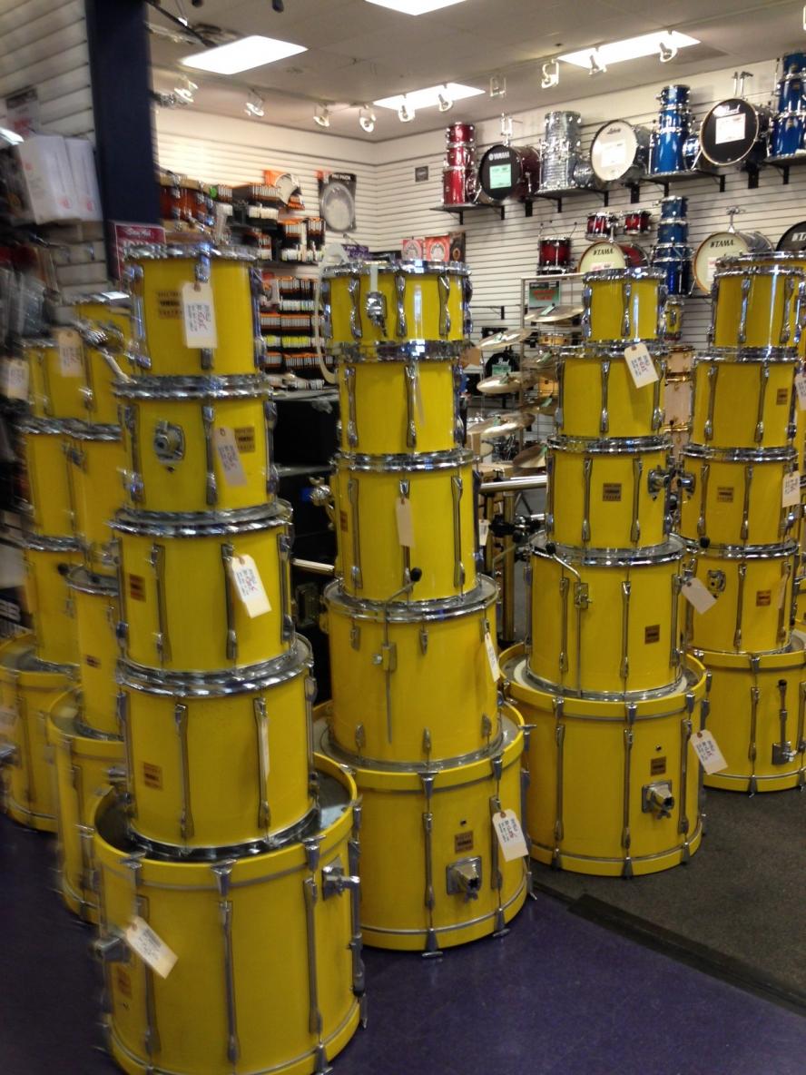 - approx 8-10 yamaha drum kits in various sizes...and all are yellow. i believe these to be 80's/90's maple kits and overall in clean condition.