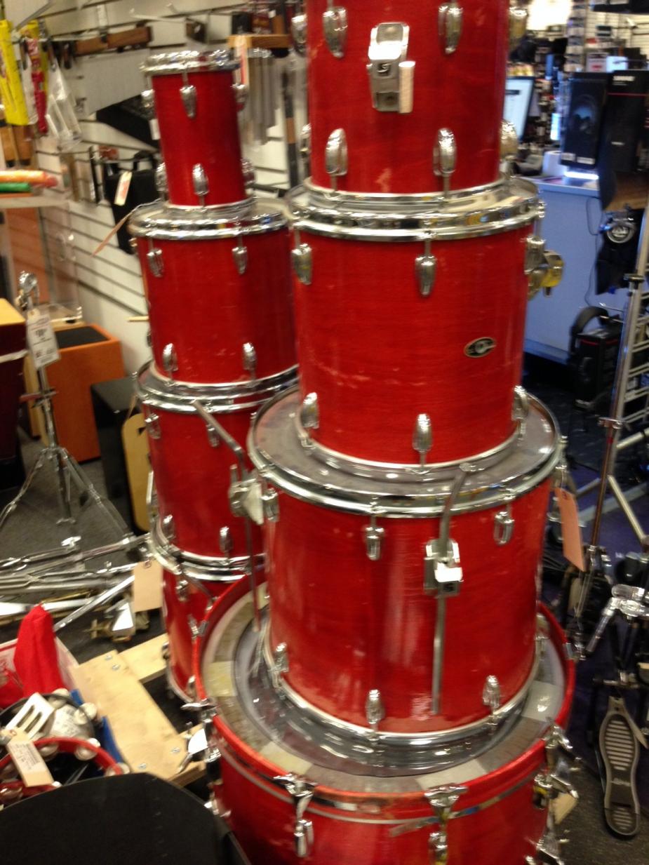 - what looked to be a 80's 6-7 pc slingerland kit in a red satin stain. had some wear but still a deal to check into.