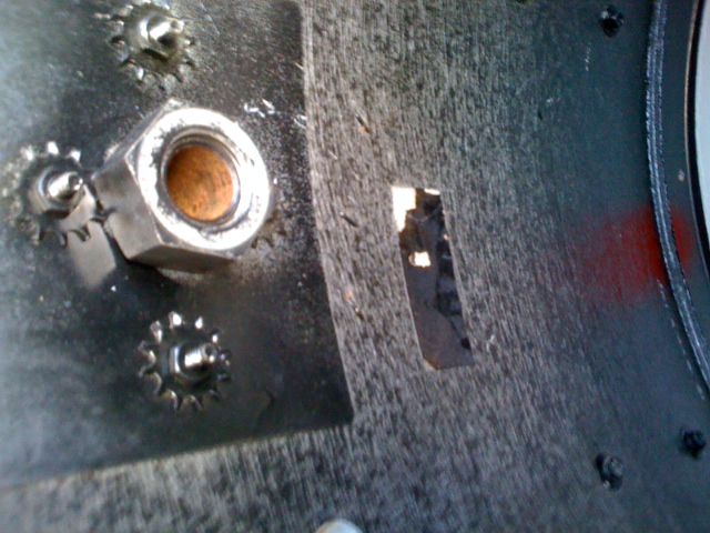 The previous owner (with the great spray painting ideal) also removed the front lugs and hoop from the kick. I replaced them with whatever they had lying around at the store. I also added spurs (bad job by me, making new holes in the drum)