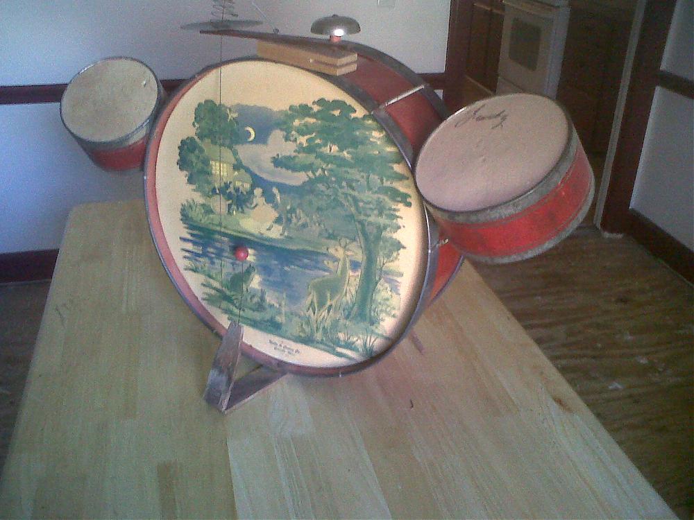 Sweet collector's piece! Made by Noble & Cooley in the 1950's long before they began making "serious" instruments. Shells are metal. Heads on front and batter side are original and intact. I would imagine the silver stripes edging the drums were once quite shiney. Bass drum is about 19+ inches diameter and the toms are 6 and 8 inches respectively. According to the company there is no way to tell how many of these exist or worth, but they do have one on display in their museum in Massachusetts. I've searched eBay and Craigslist many times and haven't seen one yet. Anyhow, I would like to sell this piece. Truthfully, I'm not sure what it's worth either, but I would consider fair, reasonable offers.