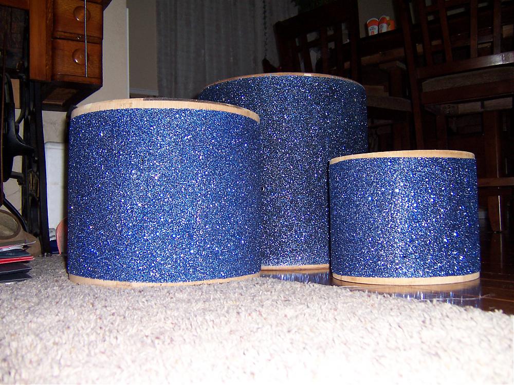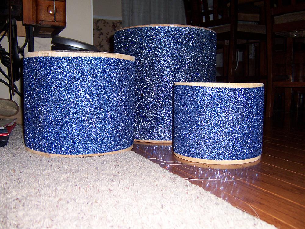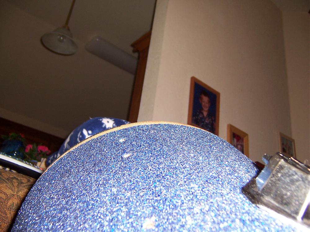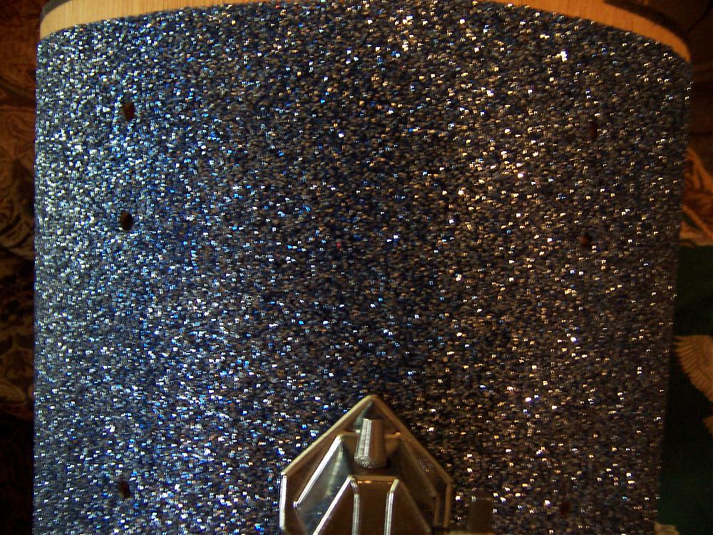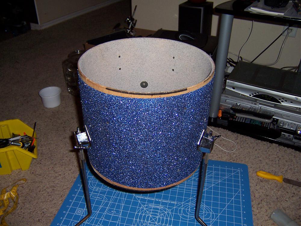 Some will flake off until you get it settled. The more lacquer you apply, the better it holds. I normally use standard glitter, but this was a fluke. I made the 16 to match my sons kit, 20-12-12-14-16- and snare. It was too late for the glitter as I did not know the glitter was so large, it was a lighter blue, and after I got into it I found the size was not really cool, so this is an accidental finish. I get this glitter at HobbyLobby, it called SueLin. The large bottles and it is a light blue and then I mix it with a dark blue.