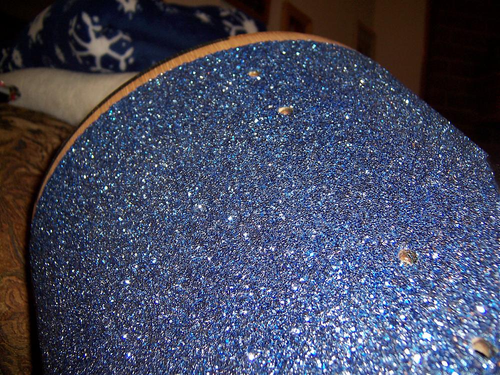 The process is simple. First, decide if you want to stain the shell a base color. Then apply a coat of lacquer and bigin sprinkling on the glitter. Make sure you have some visqueen on the ground, table, whatever surface as you will want to recycle the glitter. I use a sprinkler bottle to get a good even coating. It takes a lot of glitter, but it is cheap enough, compared to wrap. For about 40-50 bucks for the glitter and lacquer you get a seriously cool finish. Make sure to keep a baggie full so you can repair any damage.
