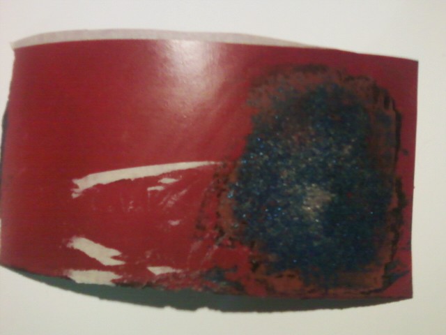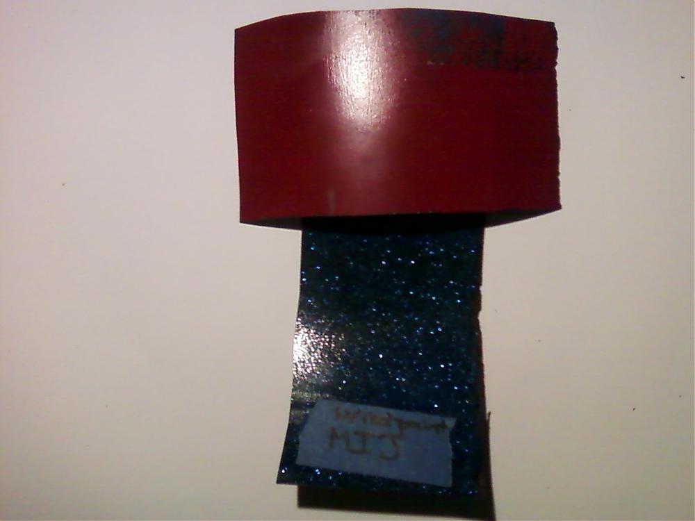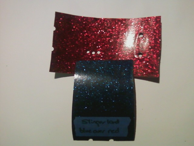 Pic 3 and 4 is MIJ blue sparkle which has already been painted over in red. These samples being already painted (for some time) are perfect to try. The last pic you can see where the red paint was wiped off in a spot. It also melted slightly. This piece is cool because I can compare my results to the already melted spot. Jeff C kindly sent several pieces of each wrap and color. So multiple tests will be done. The unpainted samples are going to my sons house tomorrow as he'll be painting a few guitars towards the end of the week. And will spray multiple coats of different colors on them.