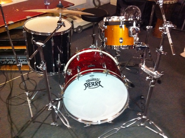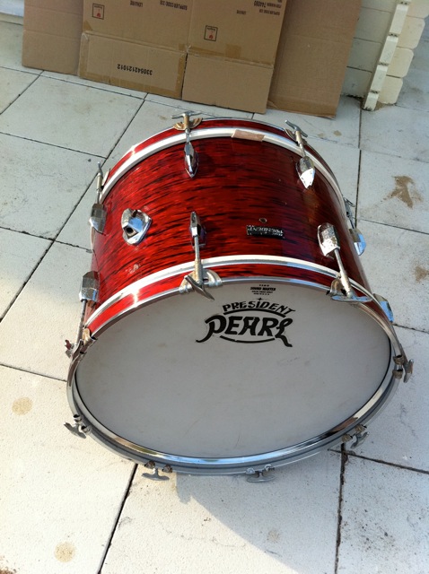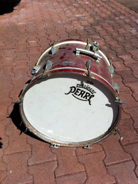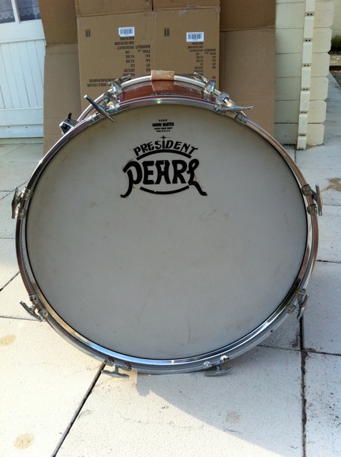 I bought in a second hand shop in France a Bassdrum Pearl President in poor condition. I think this is the first model from 1968 or 1969 ?, there was aswell the original Remo sound master skins mounted on it. It is not wood but light brown plastic fiber. I tried the bassdrum with original skins, the sound was very bad!