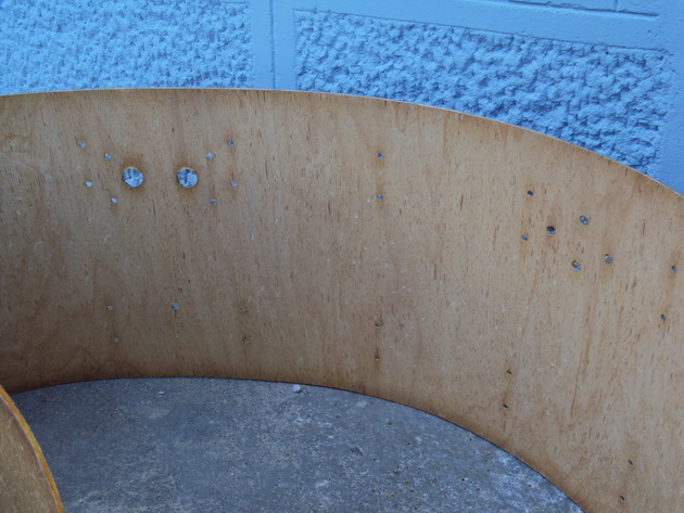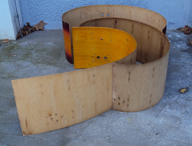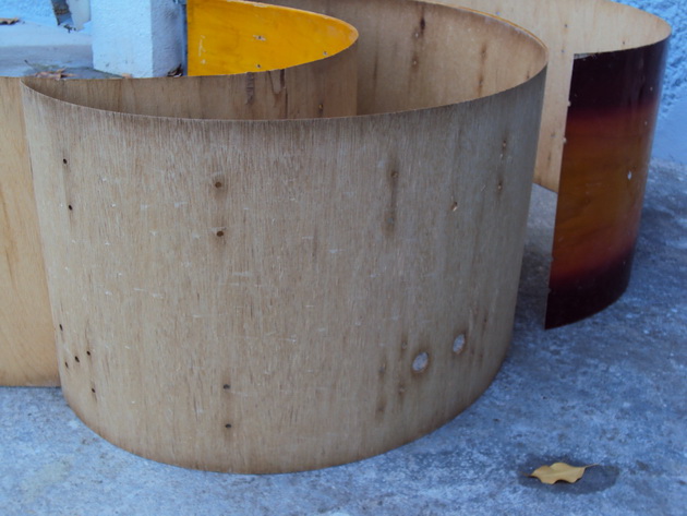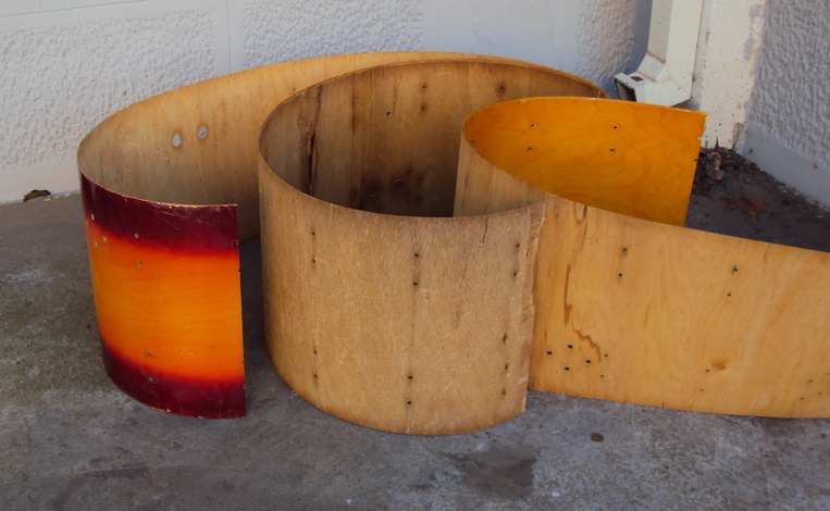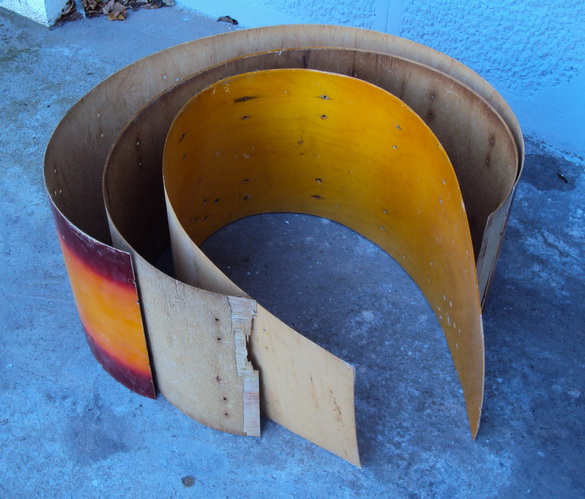 Couple of months back I found some 22-12-13 California percussion drums.In one of my previous post,coudnt recognize it,it looks like Tama stencil from late 80-ies or beganing of90-es with pearl style holes on bass drum for toms atachment.Anyway I notice some heavy separation from the plies on bass drum,and decide too try to separate them totaly.And it was very easy indeed,like they were barely glued.Now I have 3 plies,each 1/8" from 16x22 bass drum.I never saw these before,and I want to share that with you.Middle ply is not sanded et all from boath sides,and only sanded are one side of the outer and one side of the iner ply.Now,my idea is to try to make 18" bass drum from those plies.Anybody have idea how to do it in home conditions?