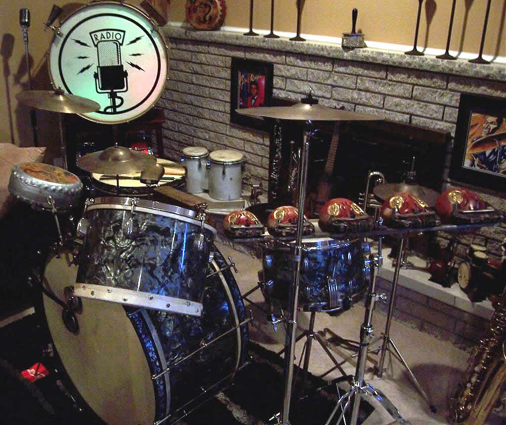 The cymbals are a combination of those that I happened to pickup when purchasing some vintage Leedy and Slingerland items some time ago. The hi-hat stand is an original Leedy piece.